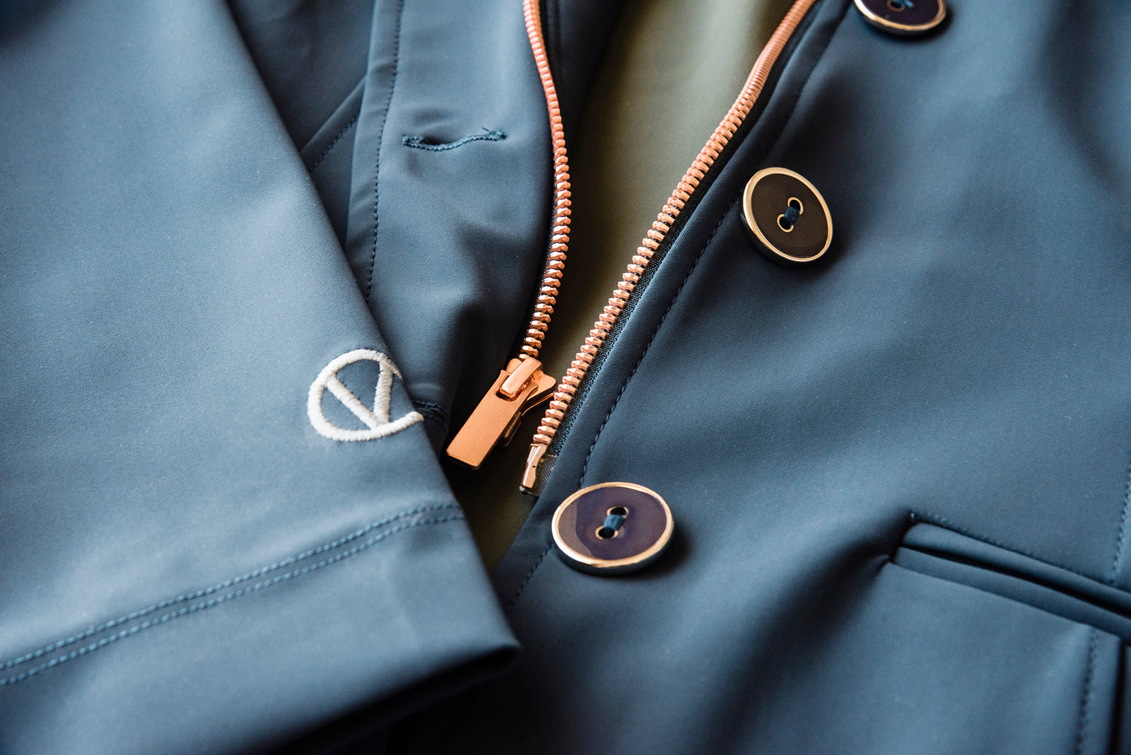 The jacket is accentuated by silver-rimmed buttons and a rose gold zipper closure.