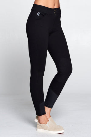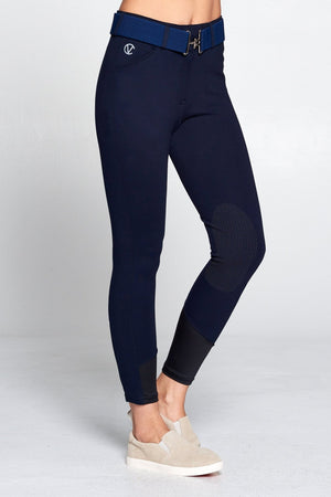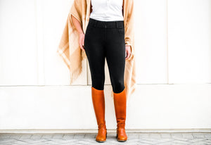The most comfortable and flattering schooling breech. Designed with a higher mid-rise waist with a ponte fabric that holds you in while the silicone grip knee patches keep you secure in the saddle. A wider elastic-lined waistband provides a more flattering fit without gapping while easily accommodating wider belts.